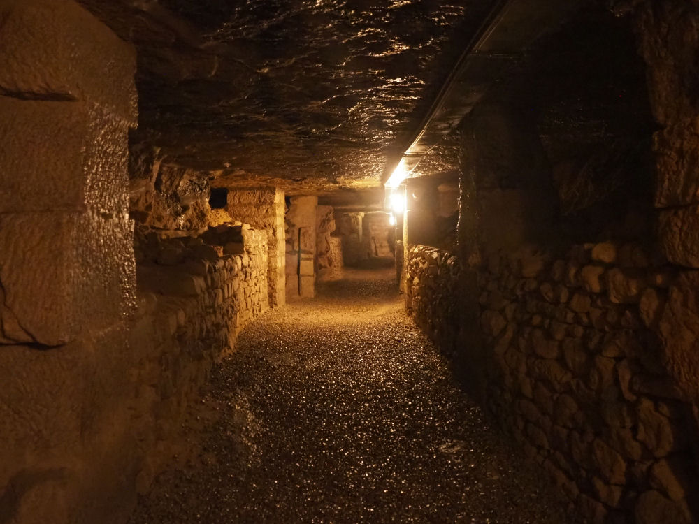 Katakombit. Kaupungin alla kulkee satojen kilometrien luolasto. Alkujaan kalkkikivilouhoksina syntyneitä käytäviä alettiin käyttämään hautakammioina 1700-luvulla. Turistit lasketaan n. kilometrin mittaiselle pätkälle. Pariisi, RANSKA