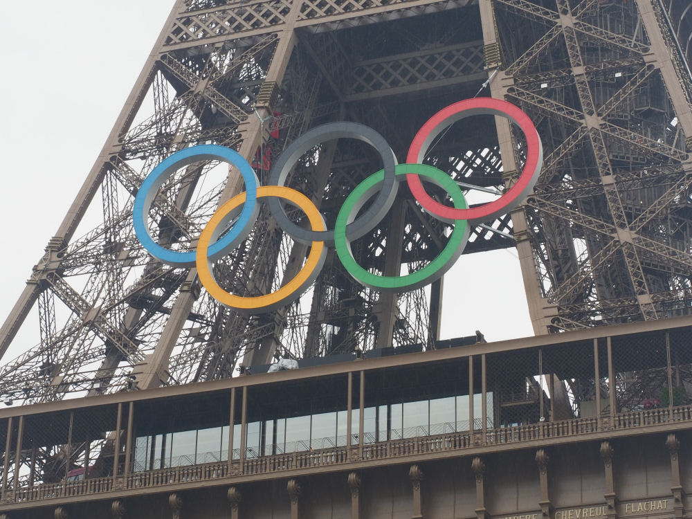 Eiffel-torni. Olympiarenkaat oli kiinnitetty torniin XXXIII olympialaisten kunniaksi. Pariisi, RANSKA