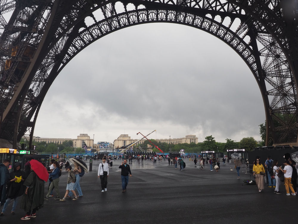 Eiffel-torni. Taustalla näkyvä Trocadéro oli koko kisojen ajan suljettuna. Parhaat kisakuvat otettiinkin aukion rantalentopallokatsomosta Eiffel-torni taustanaan. Pariisi, RANSKA