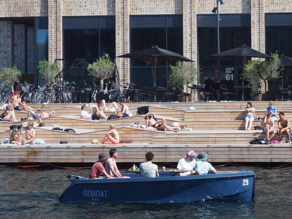 Vast'ikään keskustaan rakennettu auringonottoterassi. Venevuokraus näytti myös olevan suuressa suosiossa. Kööpenhamina, TANSKA