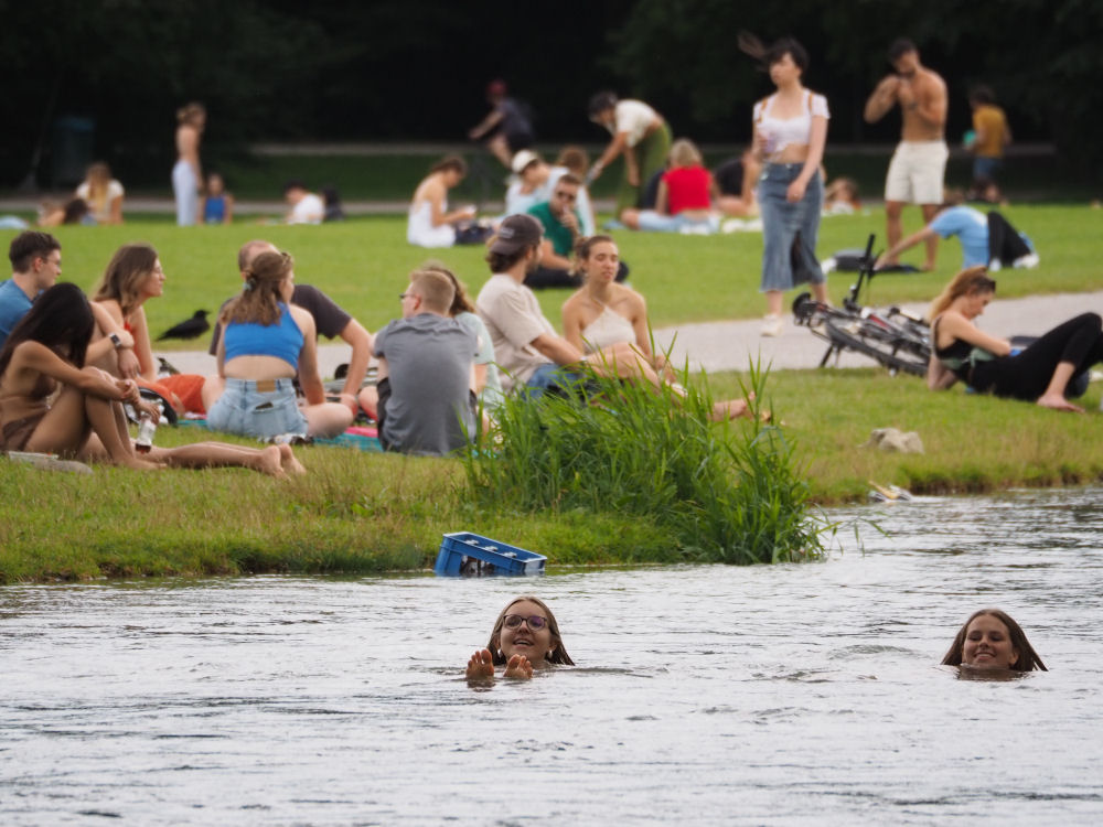 Englischer Garten. Puistossa suurta huvia on hypätä reilusti virtaavaan jokeen ja ajelehtia useampi satakin metriä alajuoksuun. München, SAKSA