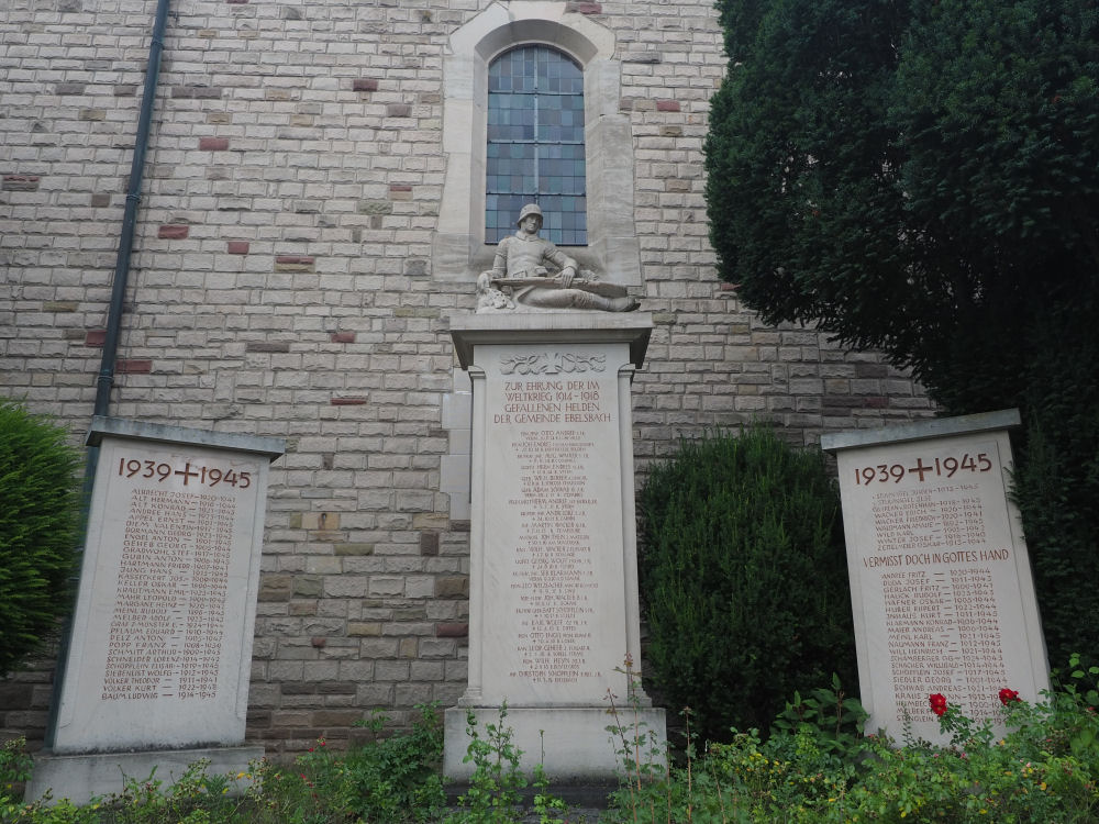 Sankt Maria Magdalenan kirkko. Ihmeen paljon on 3700 asukkaan kunnasta kuollut porukkaa maailmansodissa. Ebelsbach, SAKSA