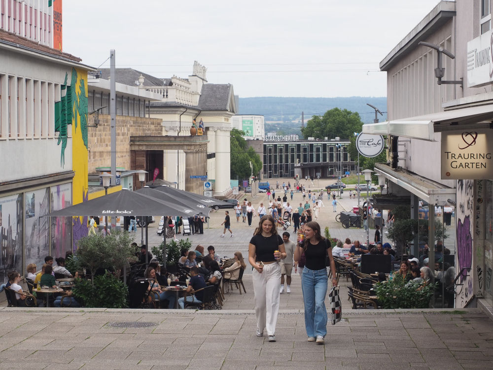Treppenstraße. Saksan ensimmäinen kävelykatu. Sodan pahoin runtelemaan kaupunkiin oli helppoa suunnitella uutta, kun kaikki piti jälleenrakentaa. Kävelykatu avattiin vuonna 1953. Kassel, SAKSA