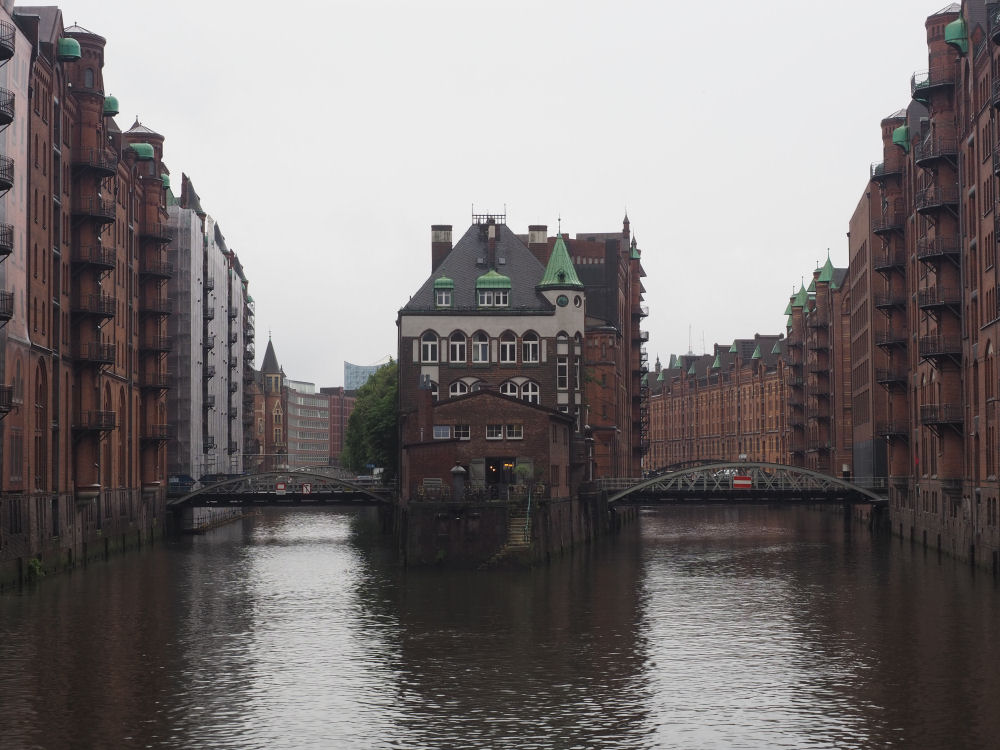 Speicherstadt. Speicherstadt on maailman suurin puupaalujen varaan rakennettu varastokaupunki. Se rakennettiin vuosina 1885–1927 sataman tarpeisiin. Nykyään rakennuksissa on kauppoja ja ravintoloita. Hampuri, SAKSA