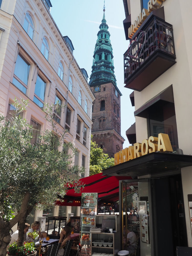 Strøget. Italialaisravintola Mama Rosa ja taustalla nykytaiteen keskus Nikolaj Kunsthal. Kööpenhamina, TANSKA