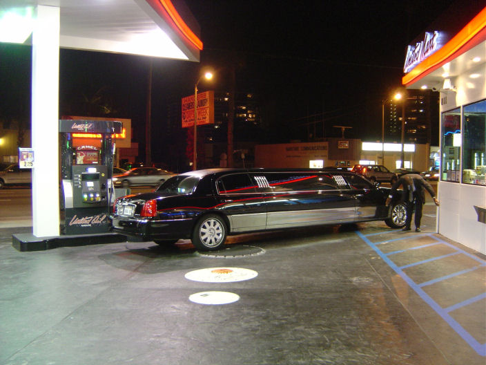 Kymmenmetrinen limo huoltoaseman pihalla.