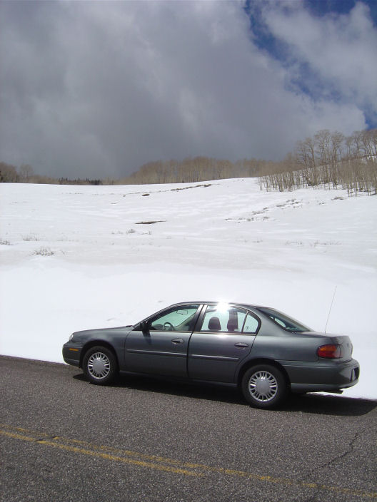 Välillä tiet kulkivat niin korkealla, että lumiraja tuli vastaan. Vuokra-auto Chevrolet Classic 2.2 automaatti. UTAH