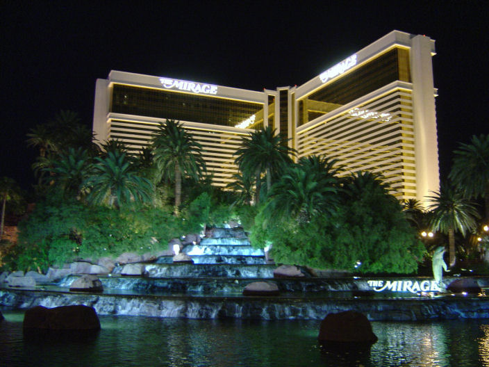 The Mirage. Valkoiset tiikerit vastaanottivat asiakkaat eteisaulassa! Tunnin välein järjestettävä valoshow oli myös yksi Las Vegasin upeimpia. LAS VEGAS