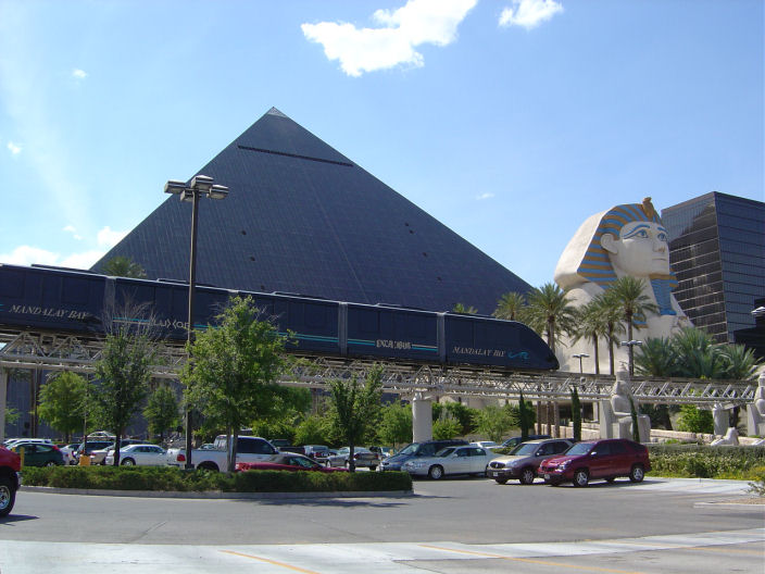 Luxor kasinohotelli. Sfinksit, pyramidit ja kaikki. Etualalla TRAM-juna kuljettamassa ihmisiä Mandalay Bayn, Luxorin ja Excaliburin välillä. Pääsee näppärästi hotellista (kasinosta) toiseen. LAS VEGAS