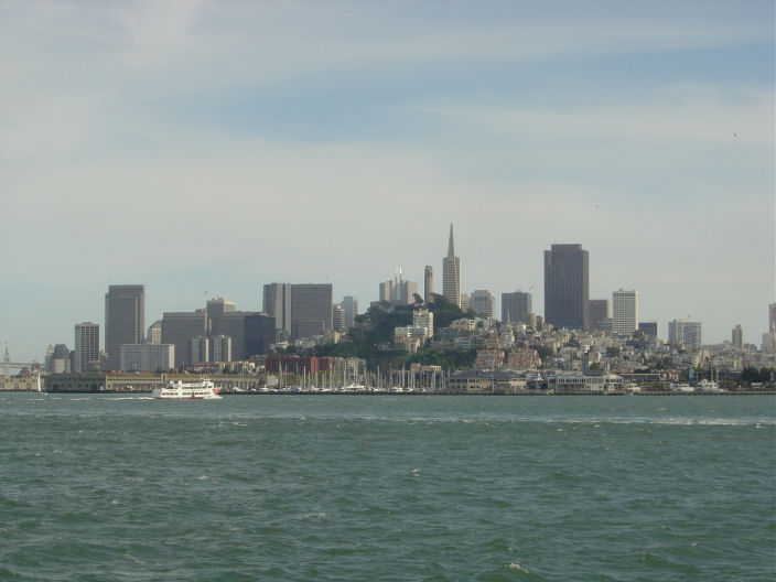 Kaupunki Alcatrazin lautalta nähtynä.