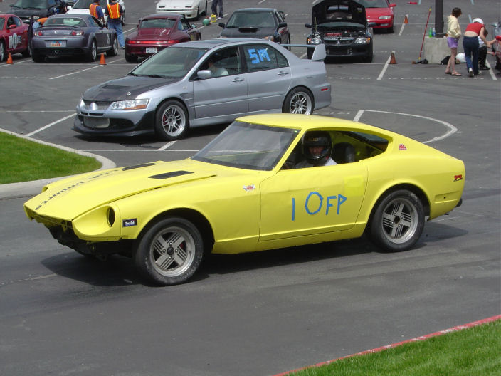 Harrasteautokilpailut jäähallin pihalla. Vanha Datsun lähdössä juuri matkaan.