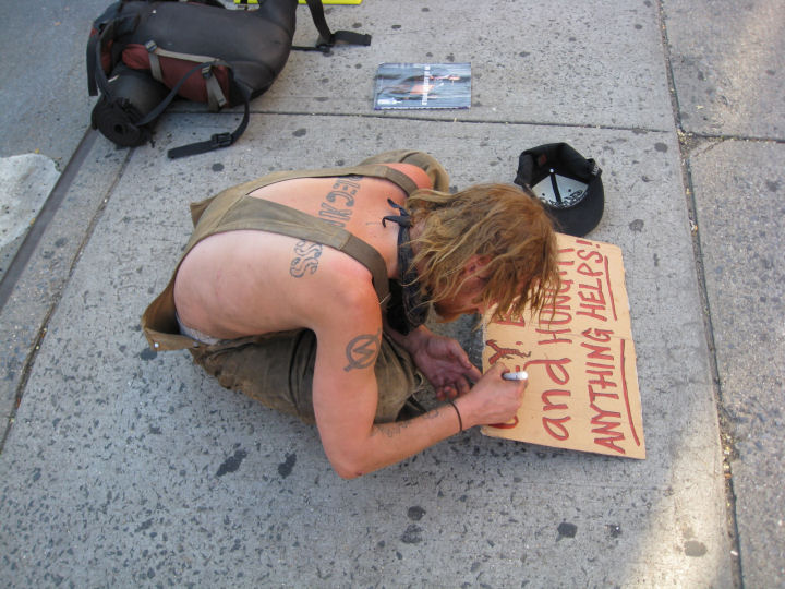 Mainoslauseena: Ruma, persaukinen ja nälissään. Kaikki kelpaa. New Yorkissa oli yllättävän paljon kerjäläisiä ja kodittomia. NEW YORK