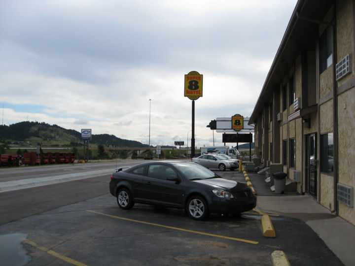 Super 8 Motel, Sturgis, South Dakota. Sekä Pontiac G5, joka kuljetti meidät koko 4600 mailin matkan rannikolta rannikolle. STURGIS