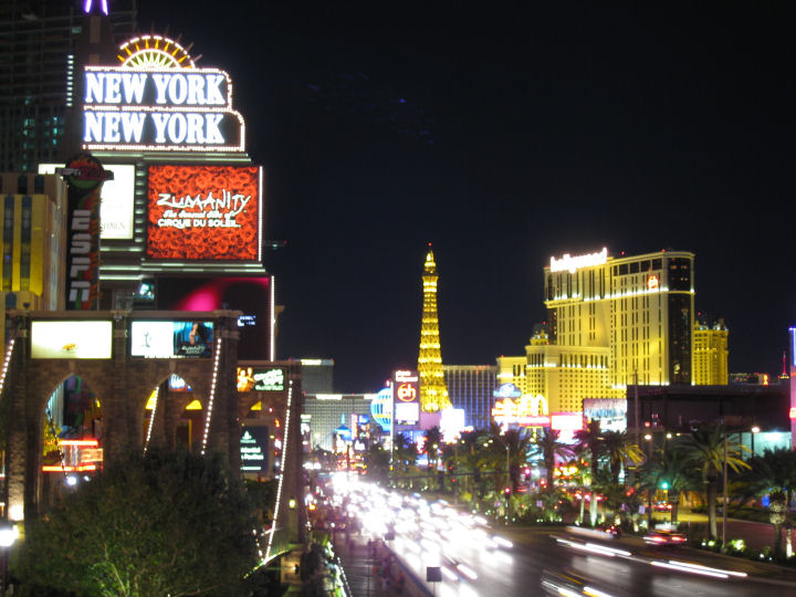 Las Vegas boulevard eli 'The Strip'. Tien vasemmalla puolella New York New York. Oikealla puolella Paris ja Planet Hollywood. LAS VEGAS