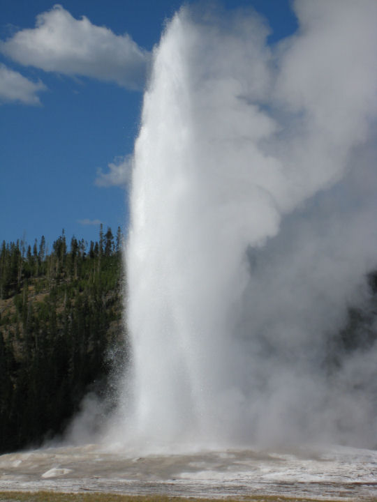 Yellowstonen kansallispuisto. Old Faithfulin kiehuva vesi purkautuu noin 30–55 metrin korkeuteen. YELLOWSTONE