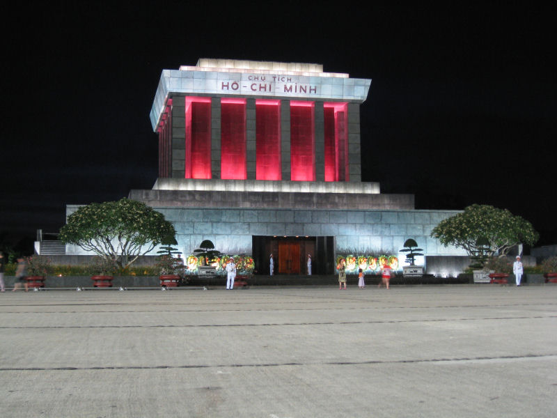 Ho Chi Minhin mausoleumi saa yöaikaan näyttävän valaistuksen.