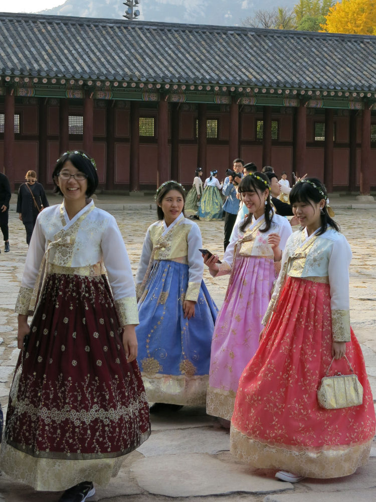 Gyeongbokgung. Ihmiset vuokrasivat innokkaasti vanhoja kansallispukuja ja kuvauttivat itsensä palatsilla.