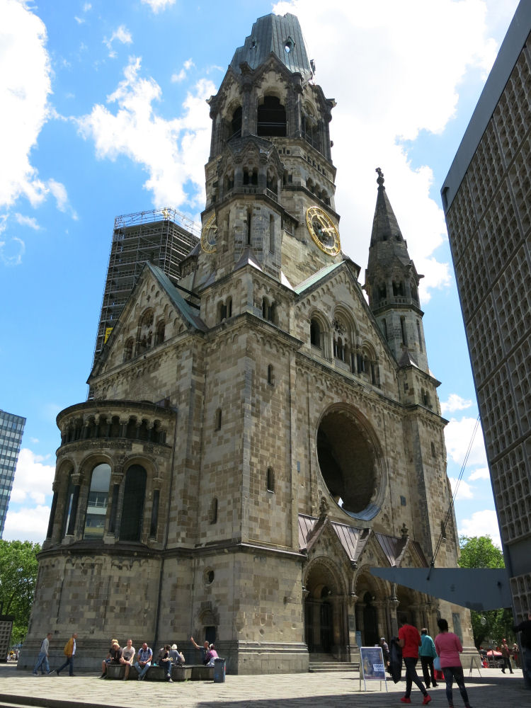 Keisari Wilhelmin muistokirkko. Toisen maailmansodan ilmapommituksissa tuhoutunut kirkko jätettiin pystyyn muistomerkiksi sodan tuhoille ja mielettömyydelle. CHARLOTTENBURG