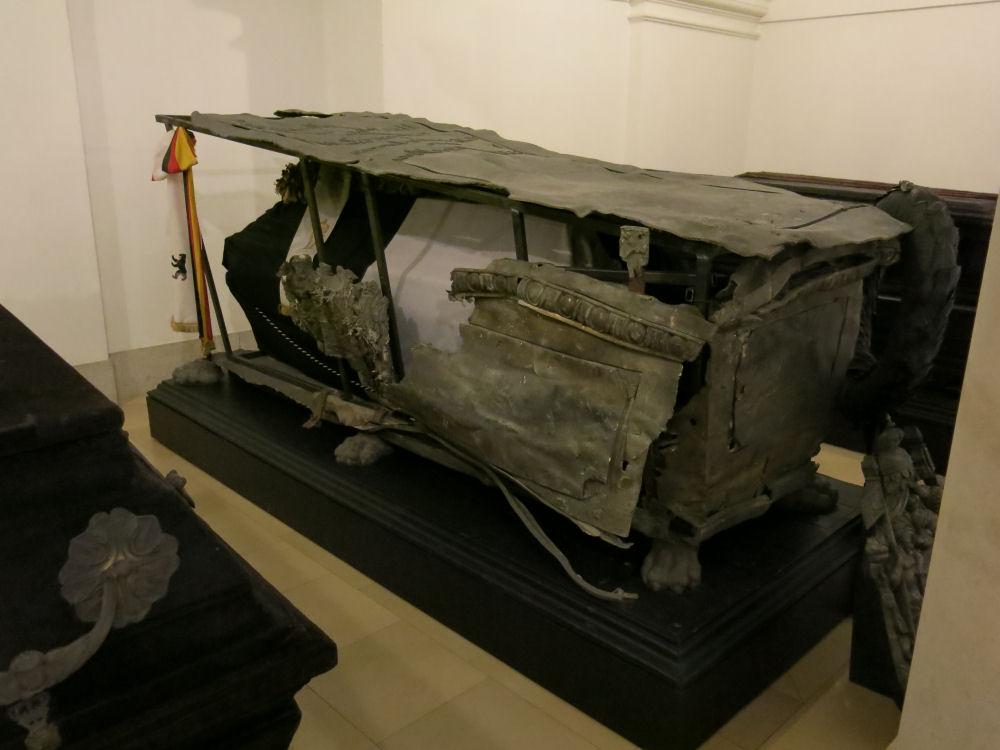 Tuomiokirkko. Kirkon alla olevaan kryptaan haudatun Preussin kuningas Fredrik Vilhelm II:n arkku on kärsinyt sodissa ja tulvissa. MITTE