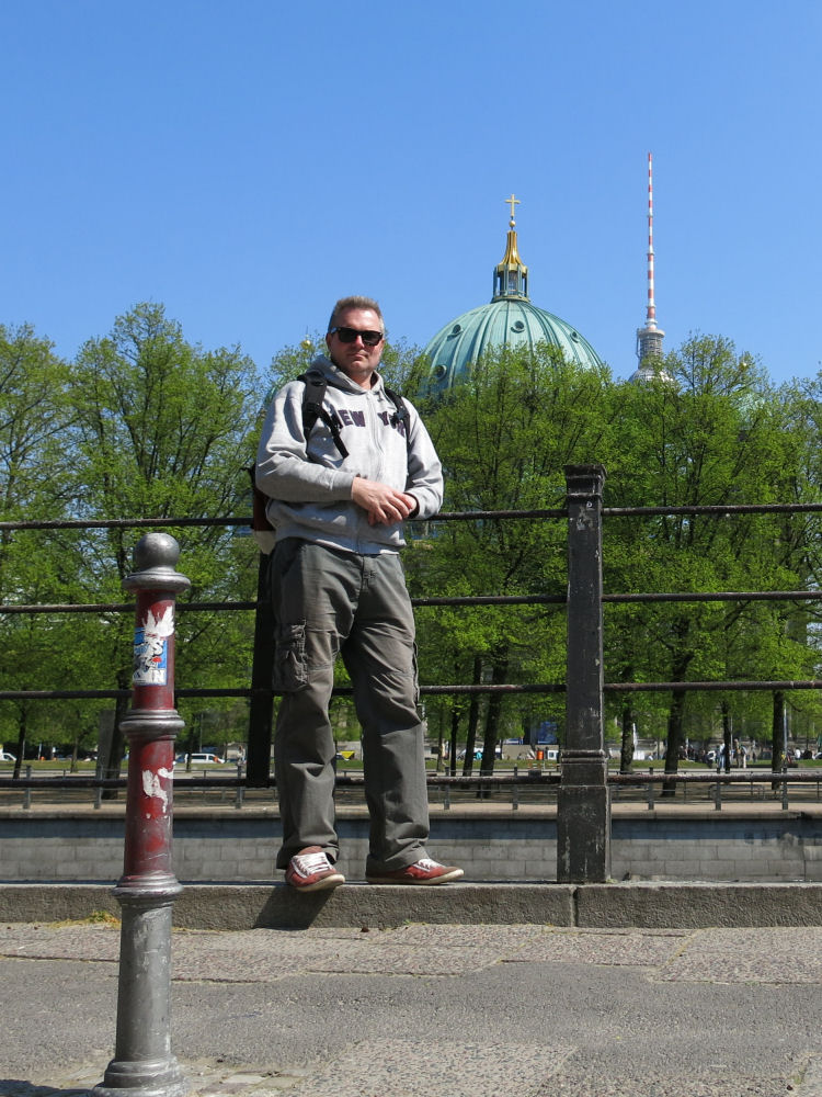 Spree-joen penkalla. Taustalla pilkottaa tuomiokirkko ja televisiotorni.