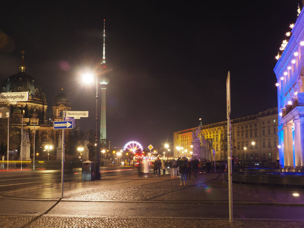 Schloßplatz. Monta maamerkkiä samassa kuvassa: Tuomiokirkko, TV-torni, kaupunginlinna ja komendantintalo.