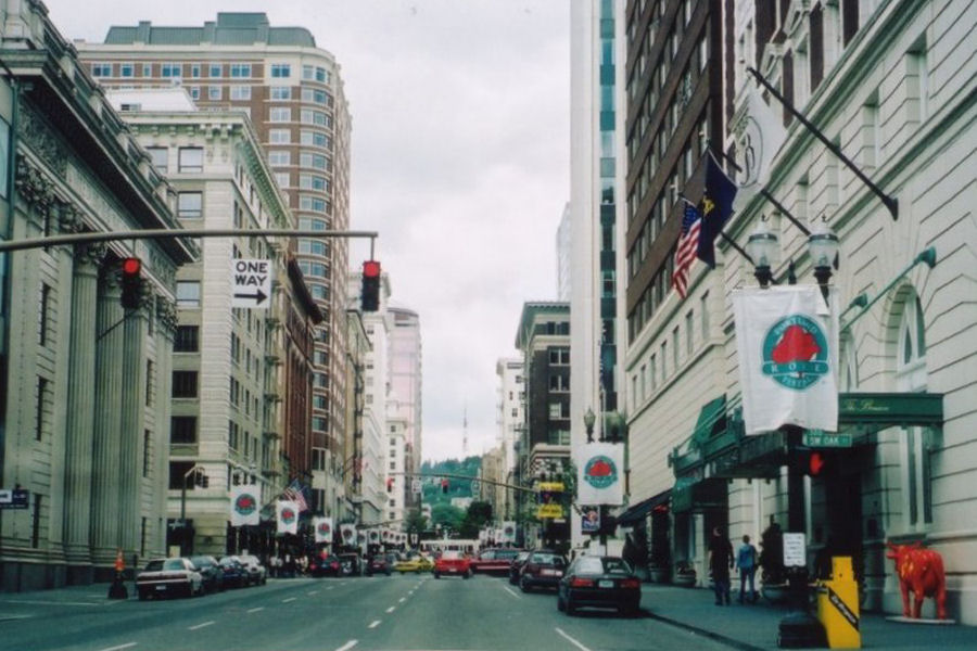 Broadway. Vasemmalla United States National Bank Buildingin pylväät, oikealla The Benson Hotel. PORTLAND