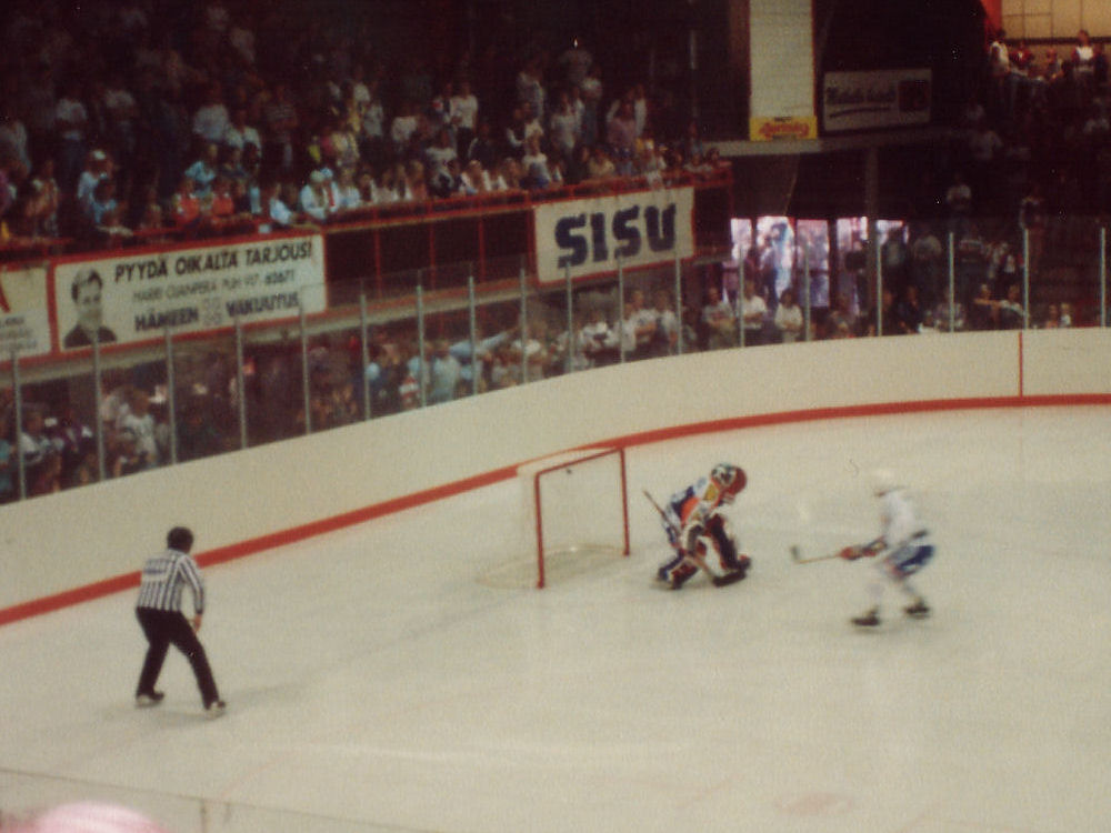 Mika Lartaman jäähyväisottelu. Laru All-Stars - HPK. Lartama itse laittaa rankkarista kiekon ohi HPK-vahti Kari Rosenbergin.