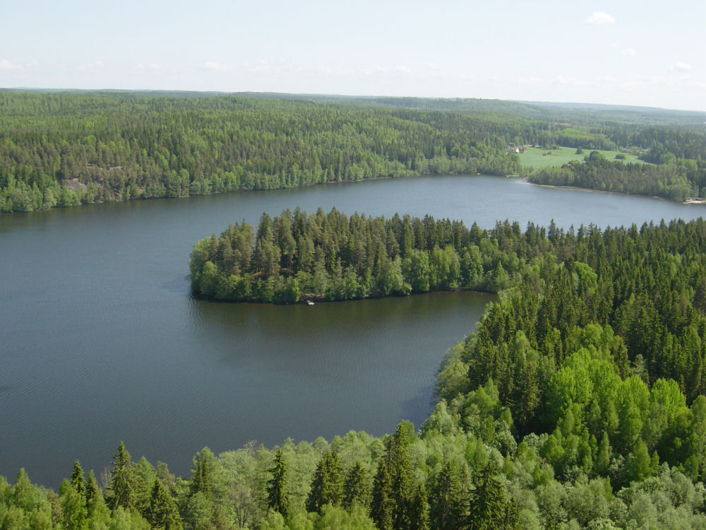 Aulangon puistometsän näkötornista avautuu näkymä Vanajaveden laaksoon, joka on yksi Suomen kansallismaisemista. Kuvassa Aulangonjärven Lusikkaniemi.