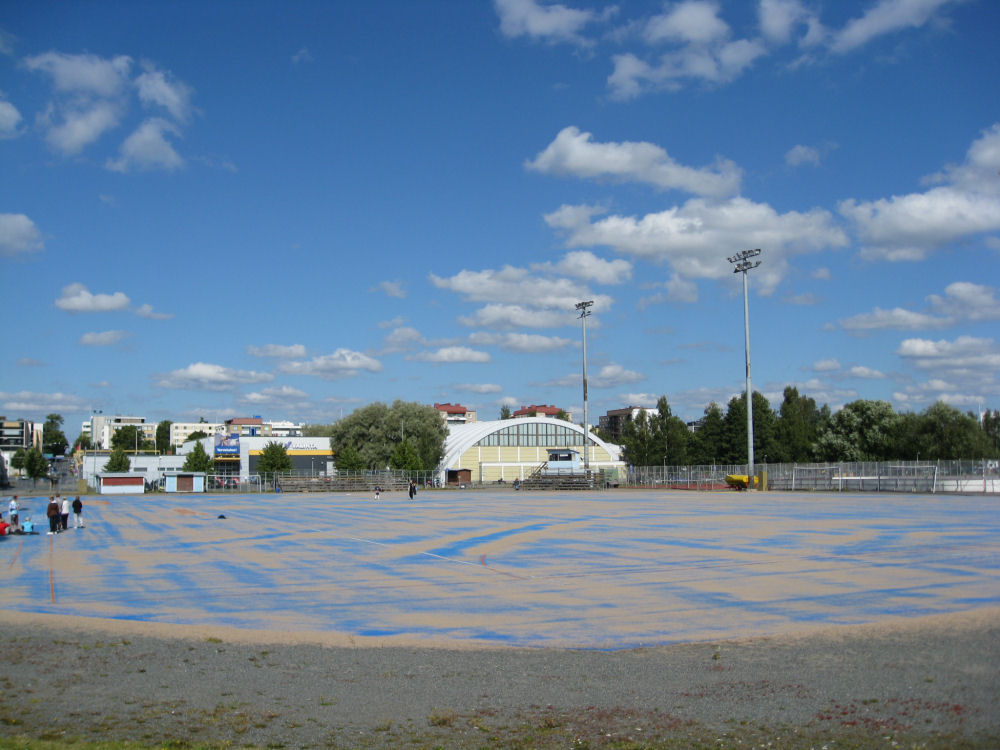 Sininen laguuni - Hiekkatekonurmi Hämeensaaressa. Taustalla purkutuomion saanut urheiluhalli Hämeenkaari.