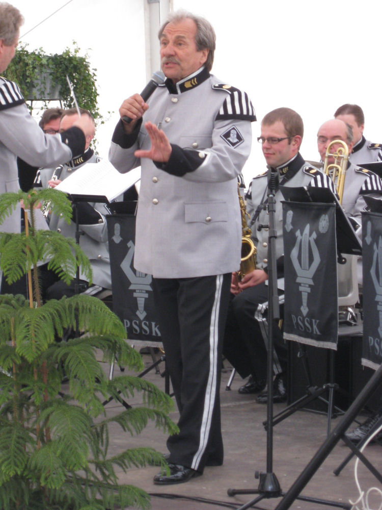 Erkki "Eki" Liikanen esiintymässä Panssarisoittokunnan kanssa Tykistömuseolla.