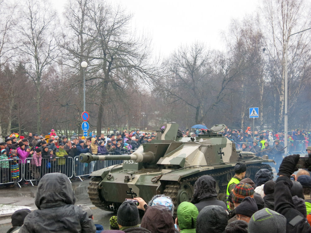 Itsenäisyyspäivän paraati. Vanha toisen maailmansodan aikainen Sturm-rynnäkkötykki (Sturmgeschütz III).