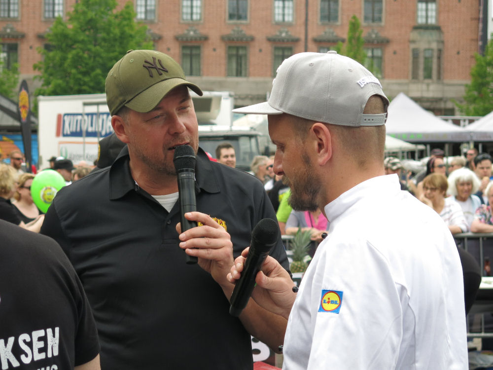 Arttu Harkki juontajana ja Hans Välimäki tuomarina grillauksen SM-osakilpailussa Hämeenlinnan torilla.