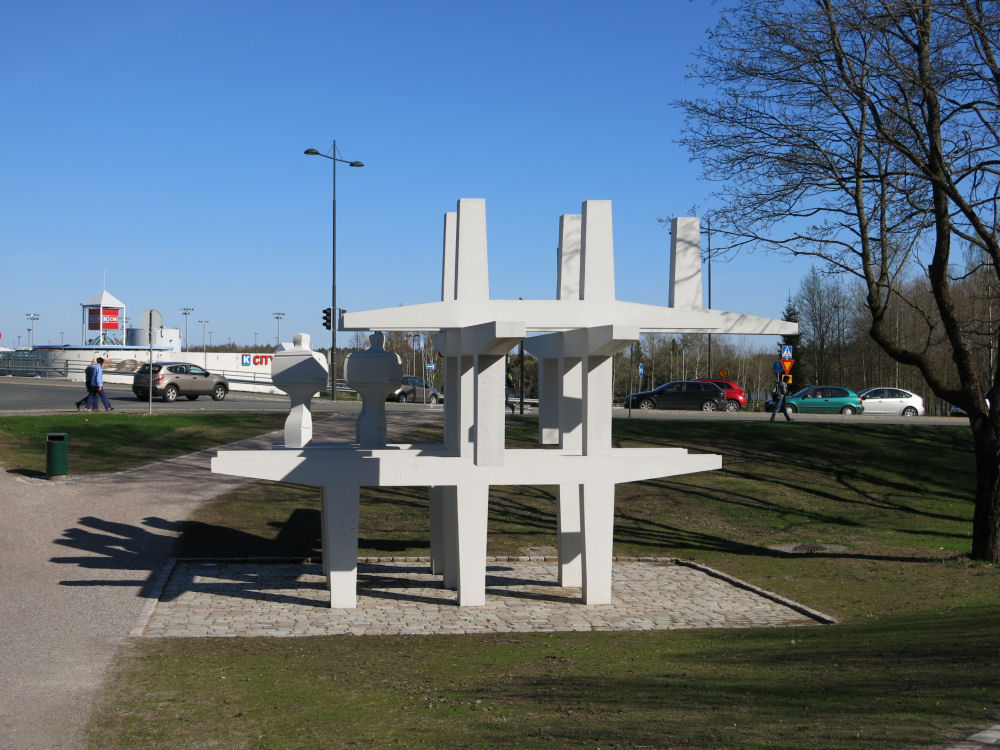 Kaupunki sai veistoksen lahjaksi hämeenlinnalaiselta rakennusliike Kummilalta vuonna 1973. Betoninen veistos kuvaa rakentajia telineillä.