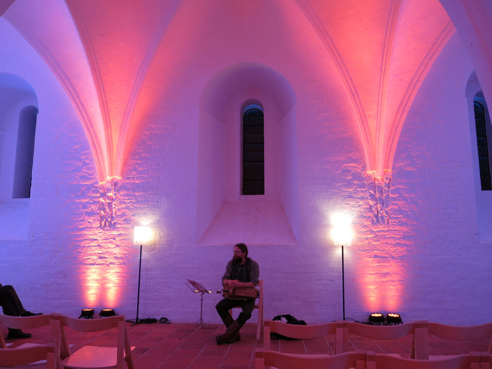 Hämeen linnan kuninkaansali Tuomaan markkinoiden juhlavaloissa. Eetu Klemetti soittamassa kampiliiraa.