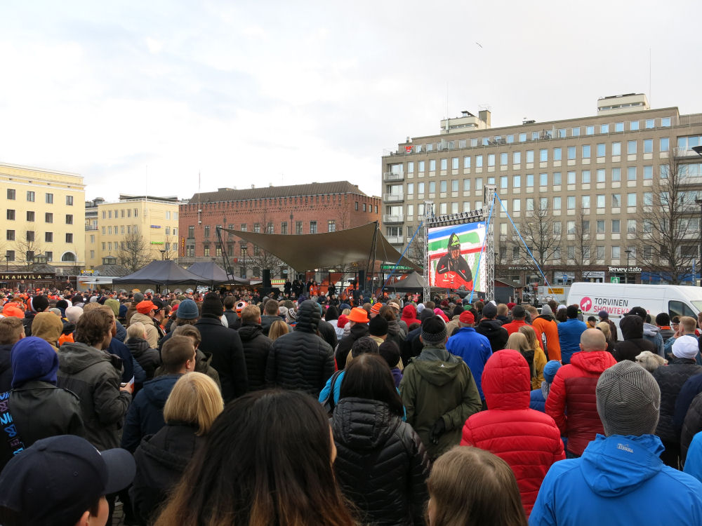 Jääkiekon miesten SM-liigan seitsemäs loppuottelu (Kärpät - HPK) pelattiin Oulussa 4.5.2019. Tuhansia ihmisiä saapui katsomaan ottelua Hämeenlinnan torille tuodulta isolta näytöltä.