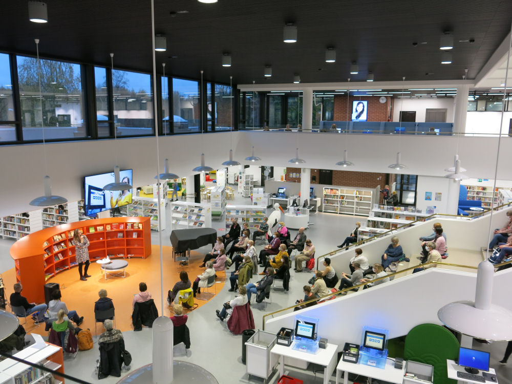Hämeenlinnan pääkirjasto aukesi vihdoin parin vuoden remontin jälkeen. Aulassa kirjailija esittelemässä uusinta teostaan.