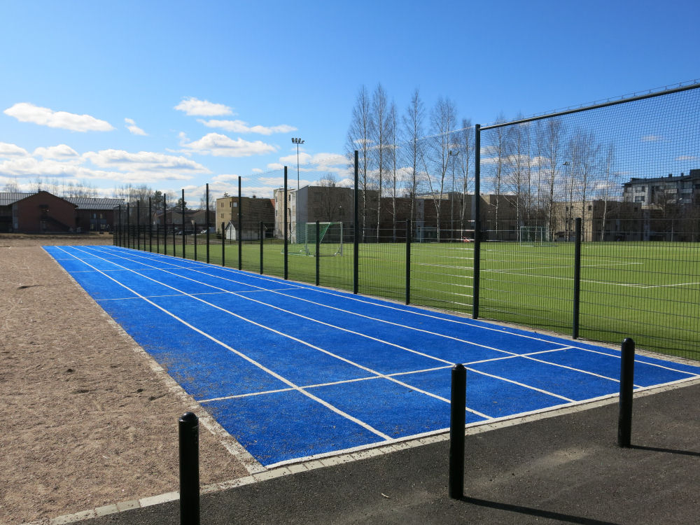 Jukolan koulun uusi juoksurata ja tekonurmi.