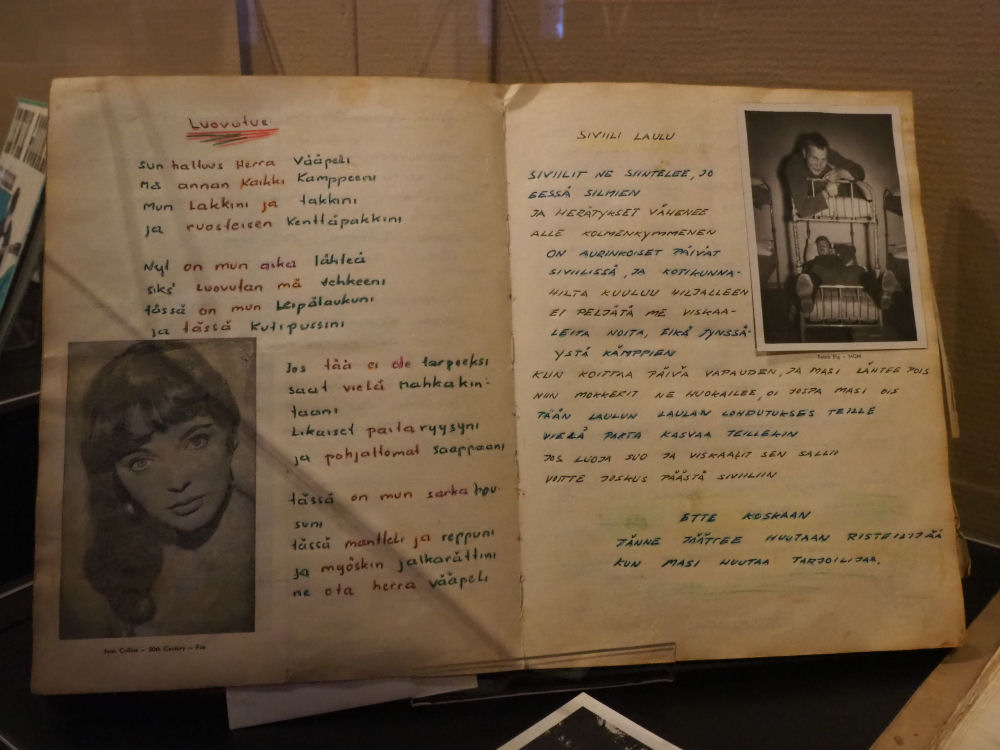 Hämeenlinnan Taidemuseo. Vexi Salmi ja Ystävät -näyttelyssä oli esillä paljon Vexin henkilökohtaisia tavaroita. Muun muassa tämä Korian Pioneerikoulussa 1962-1963 kirjoitettu armeijamuistio.