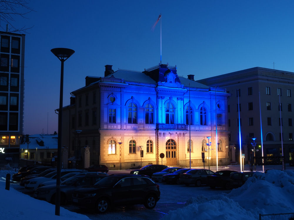 Raatihuone valaistuna Ukrainan lipun värein, Venäjän hyökättyä maahan helmikuun lopussa.