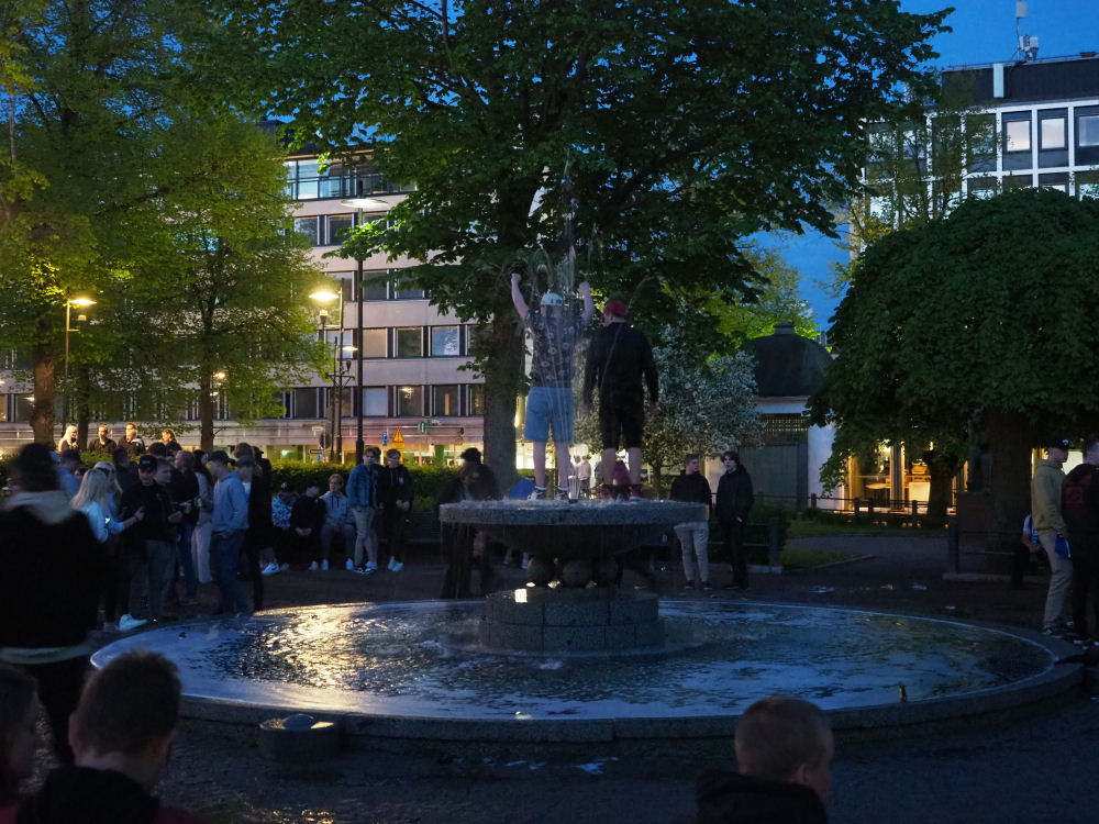 Suomen miesten neljäs jääkiekon maailmanmestaruus sai finaaliyönä ihmisiä satapäin kaupungin keskustaan. Osa kiipesi suihkulähteeseenkin, tietysti.