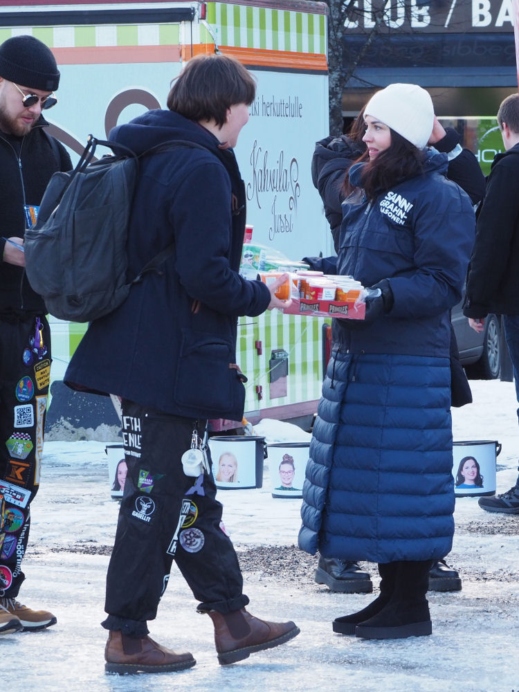 Kokoomuksen ex. ministeri Sanni Grahn-Laasonen jakamassa perunalastuja torilla ennen eduskuntavaaleja. (Kokoomuksen voitettua kevään 2023 eduskuntavaalit, Grahn-Laasosesta tuli jälleen ministeri (sosiaaliturvaministeri) (toim. huom.)).