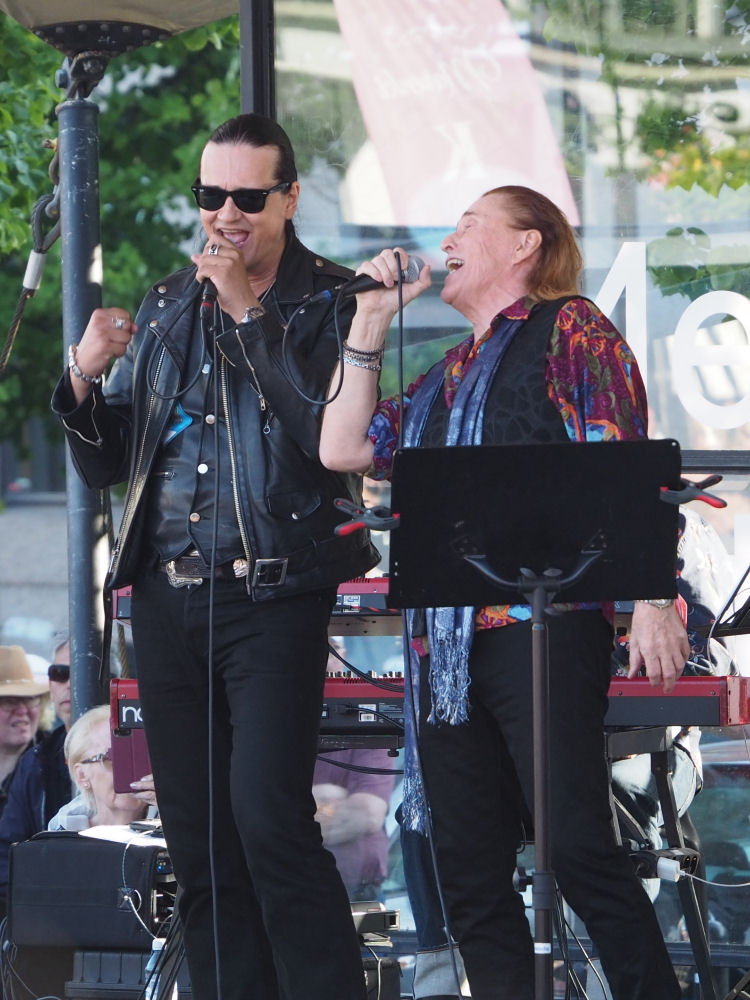 Jyrki "69" Linnankivi ja Tommi Läntinen laulavat Irwinin ikivihreitä Vexi Salmen yhteislaulukonsertissa torilla.