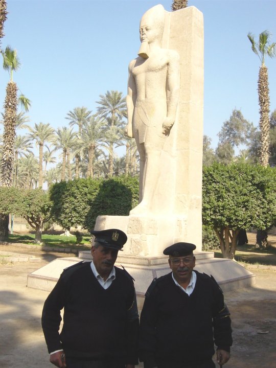 Egyptin kuuluisimman faaraon Ramses II:n patsas. Poliisit hivuttautuivat pyytämättä kuvaan vähä vähältä. Lopuksi oltiin käsi ojossa pyytämässä rahaa, kun olin heistä kuvan mennyt ottamaan. En maksanut. MEMFIS