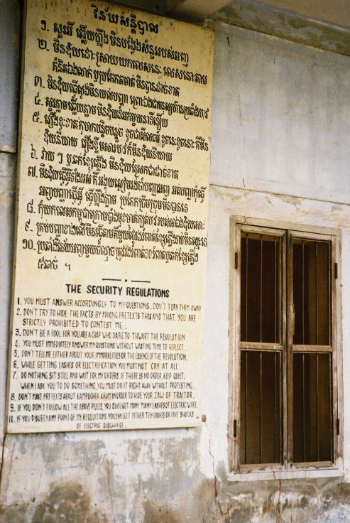 Tuol Slengin vankilamuseo. Vankilan ohjeet vangeille. Ruoskaa ja sähköiskuja annettiin pienimmistäkin rikkomuksista. PHNOM PENH, KAMBODŽA