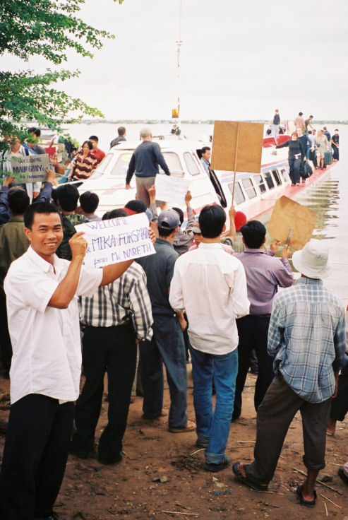 Jokiveneellä muutamassa tunnissa Phnom Penhistä Siem Reapiin. Taksikuski oli kyltin kanssa vastassa rannalla. SIEM REAP, KAMBODŽA