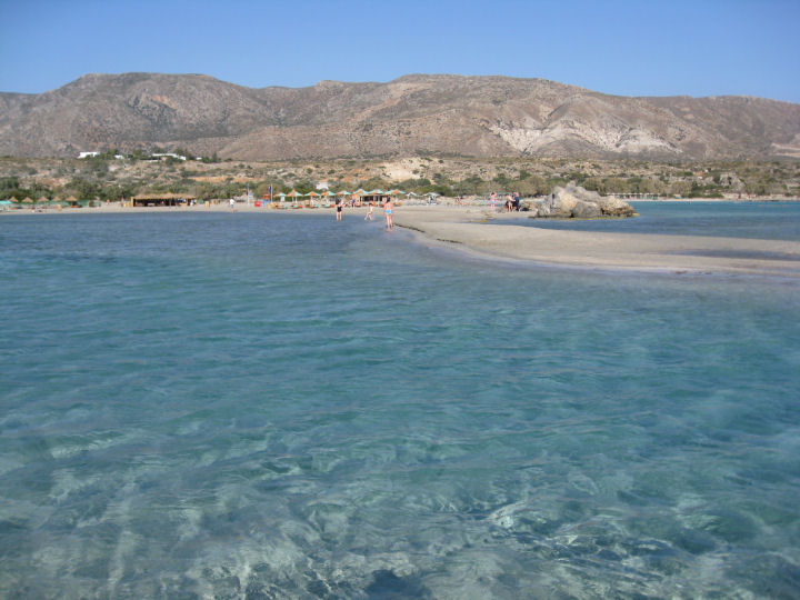 Elafonisi on saari Kreetan länsirannikolla. Tosin laskuveden aikaan saarelle voi kävellä lähes kastumatta. (Kuva otettu saarelta mantereelle päin). ELAFONISI