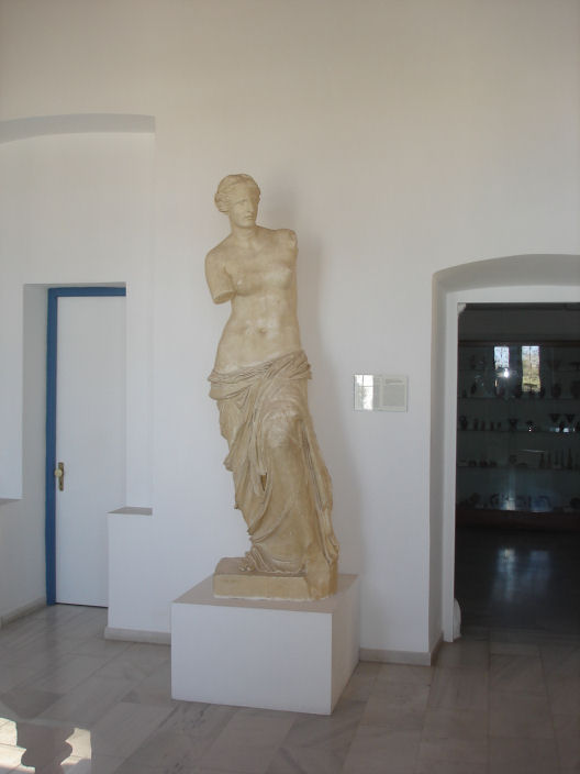 Afroditen (Milon Venus) patsaan kopio Miloksen argeologisessa museossa. Patsaan kädet "hukkuivat" vuonna 1820 pitkään kestäneen kuljetuksen ja varastoinnin aikana.