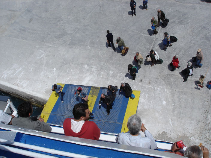 Laiva pysähtyi muutamaksi minuutiksi moneen satamaan Miloksen ja Ateenan välillä. Tässä ollaan Sifnoksella. Ihmisten lastaus menossa.