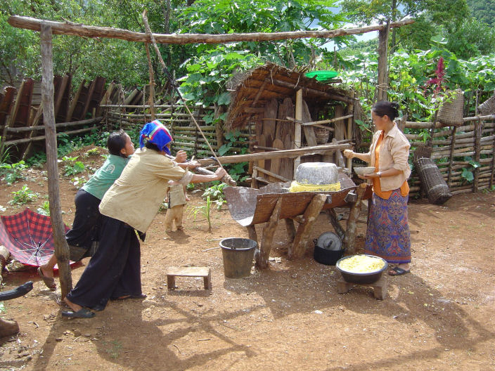Hmong-heimolaisia. Naiset jauhavat maissia sikojen ruuaksi.