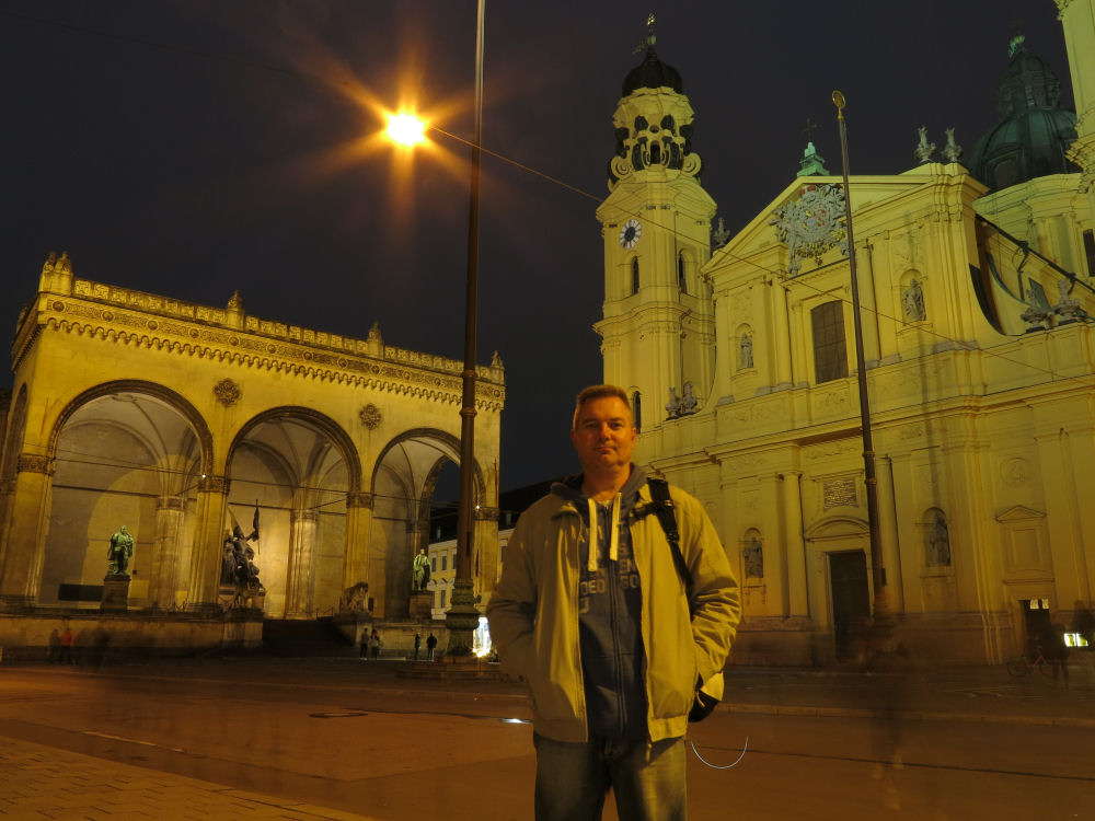 Feldherrnhalle, Theatinerkirche ja minä Odeonsplatzilla.